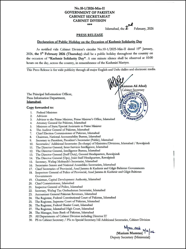 نوٽيفڪيشن ۾ صاف ڄاڻايل آهي ته 5 فيبروري 2026 تي ڪشمير جي ڏينهن جي ڪري سڄي ملڪ ۾ عام موڪل ٿيندي۔